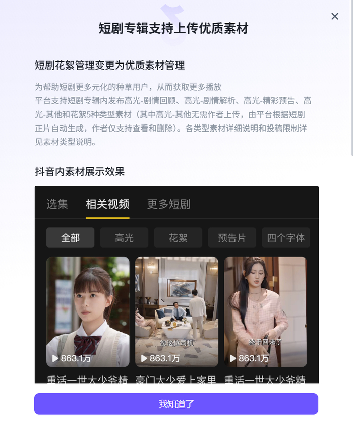 在运营策略方面,抖音也上线了对应的活动。一项是高光视频为端原生视频引流,可以为端原生带来额外曝光。就是类似于达人切片的引流视频,支持最多上传32条视频,包括高光-剧情回顾(10)、高光-剧情解析(10)、高光-预告片(2)、花絮(10)。