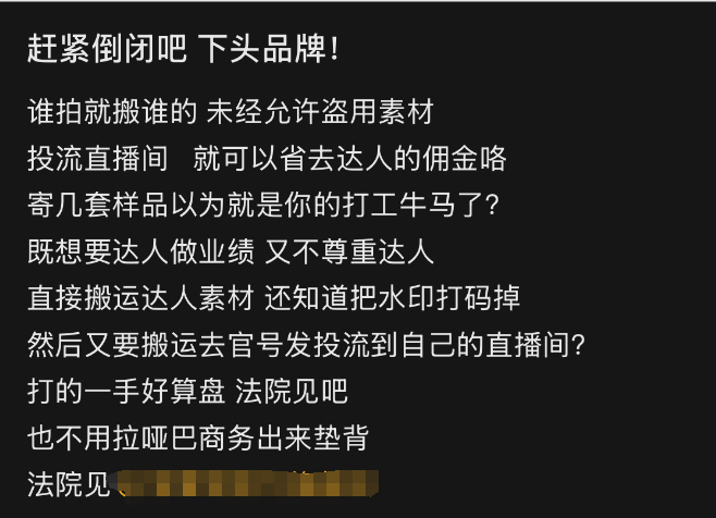 因此,有达人称构思一个产品该怎么拍、拍出亮点,就要花费好几个小时乃至一天。而如果辛苦拍摄的视频本就没有基础费用,还要被商家摘取果实,无疑直接被断了财路,这是让众多达人不得不公开讨伐乃至诉诸法律途径的原因。