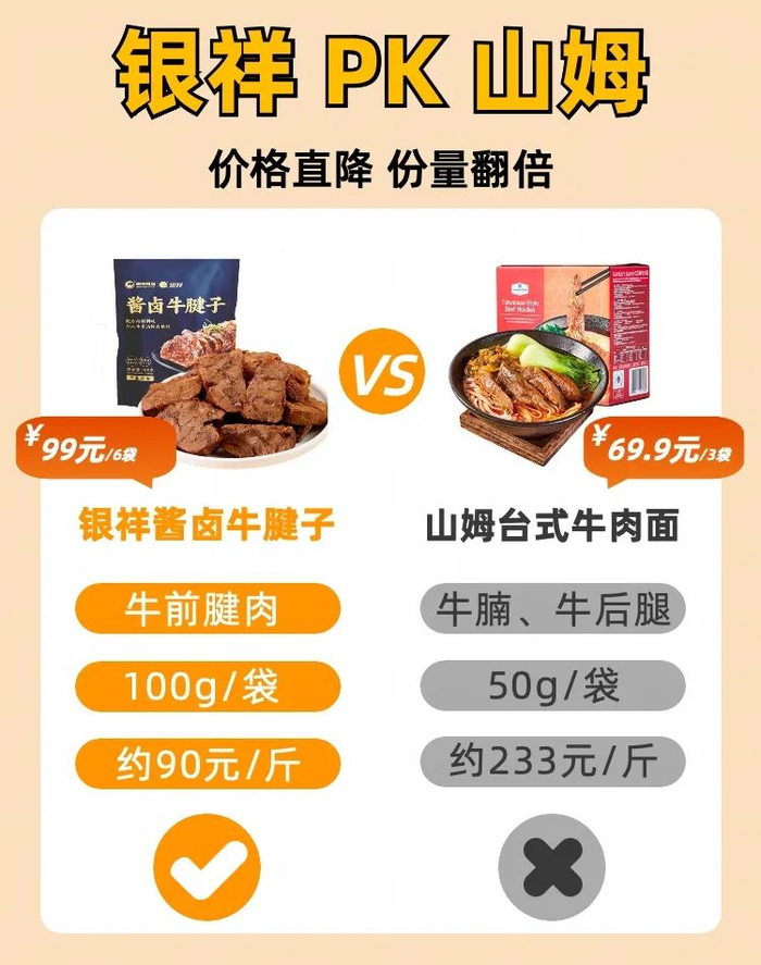 “牛肉面一盒69.9(3包),平均一包近25元,牛肉只有50g,银祥自家的酱卤牛腱子600g才99元?”