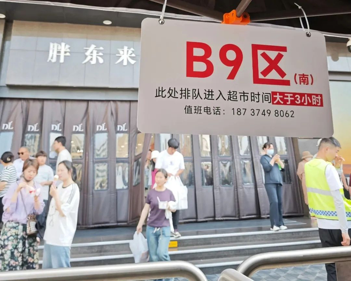 同样是在5月2日这一天,河南的胖东来也是大排长龙,队伍里还挂着一个“此处排队进入超市时间大于3小时”的牌子。