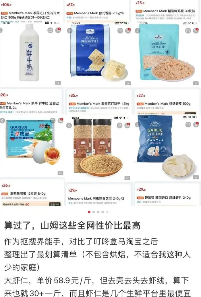 曾经就有博主对比了山姆、盒马、叮咚和淘宝同类产品的价格,博主发现山姆的某些商品是全网性价比最高的。