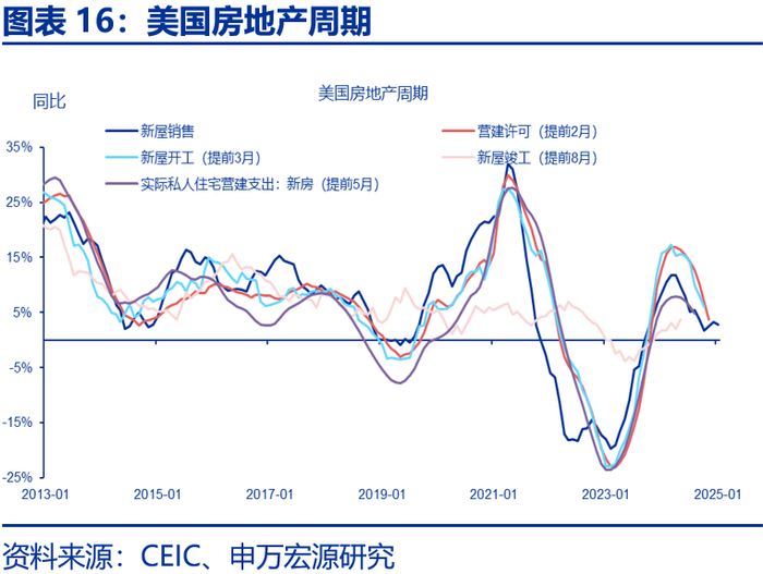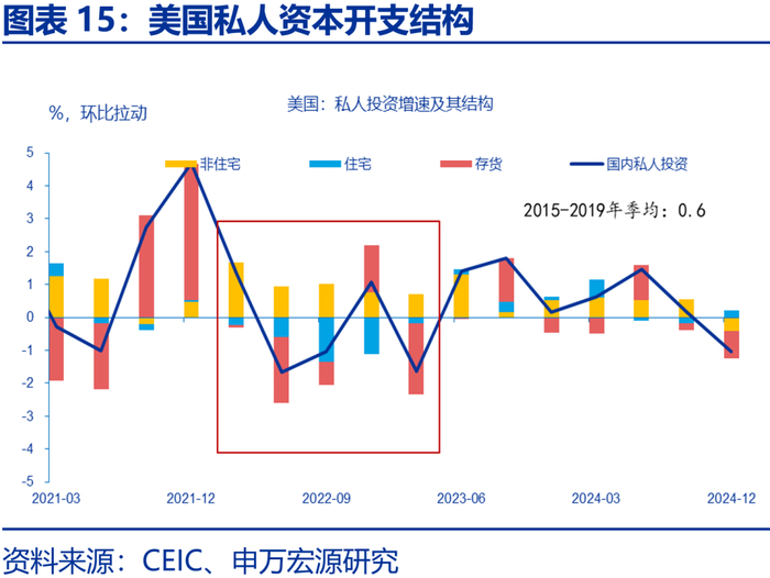 实际上,私人资本开支的收缩可以被视为衰退的“前奏”。以衰退前的两个季度为观察期,私人资本开支多数出现了负增长(8次衰退中有6次),平均拖累GDP增速0.3个百分点。在私人资本开支的分项中,住宅投资是主要拖累项(平均拖累0.8个百分点),而非住宅投资多数维持正增长(0.5%正贡献)。以2024年下半年为观察期,私人资本平均拖累GDP水平-0.4个百分点——与历史均值类似,但由于私人消费依然维持韧性(2.6%的正贡献),且住宅投资基本持平,我们倾向于认为,当前美国经济的结构不符合衰退前夜的特征。