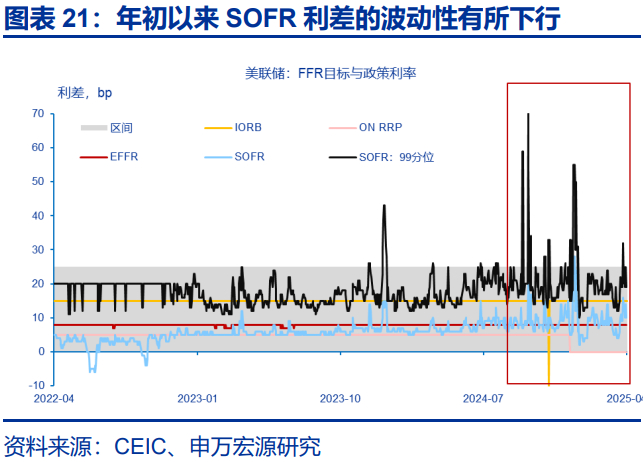 我们倾向于认为,基于第一次缩表(QT,2017-2019年)的经验和教训,再加上利率走廊体系的进化,回购危机重演的概率或有所下行。2024年6月和2025年3月,美联储已经两次放缓QT速度——分别将每月缩减国债的规模从600亿美元下降至250亿美元和50亿美元(保持MBS缩减规模250亿美元),2024年12月还进行了一次技术性降息(FFR目标区间下调25bp,但逆回购利率下调30bp)。截止到4月底,美联储已经累计减持证券近2.1万亿美元(2022年6月开始缩表)。从隔夜利差或准备金需求弹性看,当前美国货币市场的流动性或处于从过剩(scarce)向充足(ample)阶段转换。