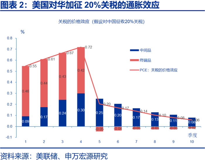 根据美联储的测算,假设美国对中国加征20%关税:当季美国CPI将上行0.55个百分点,在第4个季度达到峰值(0.72%);当季美国GDP下行0.10%,并在第4个季度达到最大值0.88%。波士顿联储拆分了不同商品的增加值来源(直接与间接),测算结果认为,美国对中国加征60%关税、对其他国家加征10%关税,美国PCE通胀或上升1.4-2.2个百分点(直接效应+间接效应)。