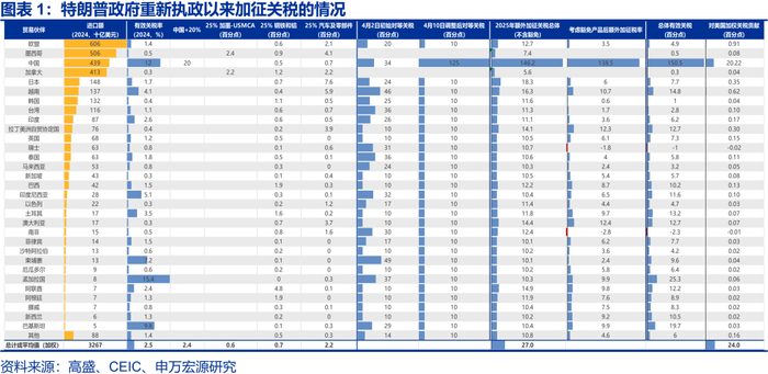 按照2024年进口商品加权结算,美国所有商品的平均关税税率已经升至27%(考虑豁免后为24%)。北京时间4月3日,美国“对等关税”落地,税率水平大超市场预期,叠加后续中美双边关税的升级,平均税率已经升至27%。其中,特朗普政府对中国加征的关税税率已经升至146.2%,贡献了27%当中的20个百分点,其他国家合计贡献了7个百分点 。