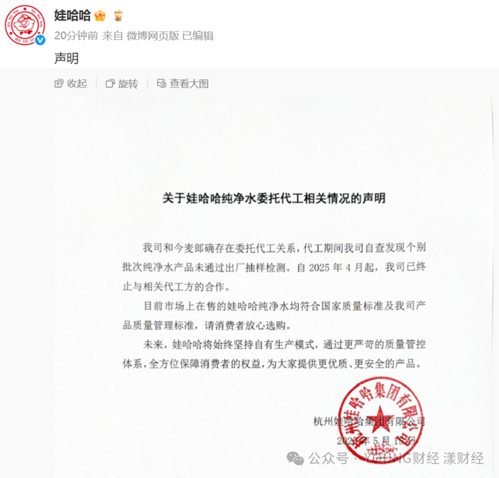 然而,随着事件持续发酵,5月15日,娃哈哈官方发布声明,证实了与今麦郎存在委托代工关系。声明称,去年因水产品市场需求快速增长,公司产品结构对应调整,导致产能紧张,因此委托代工厂生产。不过,代工期间自查发现个别批次纯净水产品未通过出厂抽样检测。自2024年4月起,娃哈哈已终止与相关代工方的合作。同时,娃哈哈强调目前市场上在售的娃哈哈纯净水均符合国家质量标准及公司产品质量管理标准,请消费者放心选购。
