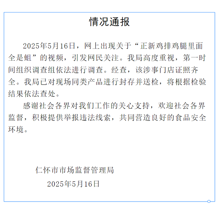 5月16日,仁怀市市场监督管理局发布情况通报:2025年5月16日,网上出现关于“正新鸡排鸡腿里面全是蛆”的视频,引发网民关注。我局高度重视,第一时间组织调查组依法进行调查。经查,该涉事门店证照齐全。我局已对现场同类产品进行封存并送检,将根据检验结果依法查处。