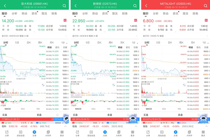 6月10日,容大科技(9881.HK)、新琪安(2573.HK)、METALIGHT(2605.HK)同一天登陆港交所,其中2只新股大涨,1只新股大跌,最终都上演了一场“比比谁跑得快”的比赛。