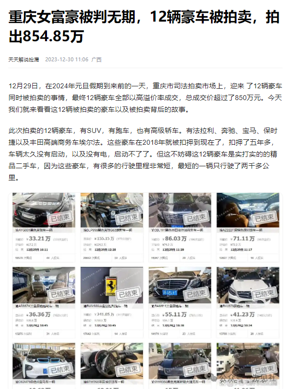 2024年元旦前,重庆司法拍卖了李仕林名下的12辆豪车,有奔驰、宝马、法拉利、保时捷,等等。总成交价854万。