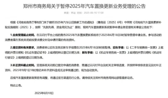 洛阳6月12日暂停、许昌6月13日暂停、新疆6月15日24时起全面暂停汽车置换更新补贴、郑州6月18日起暂停汽车置换补贴、沈阳计划6月30日24时起叫停汽车置换更新等5项补贴。