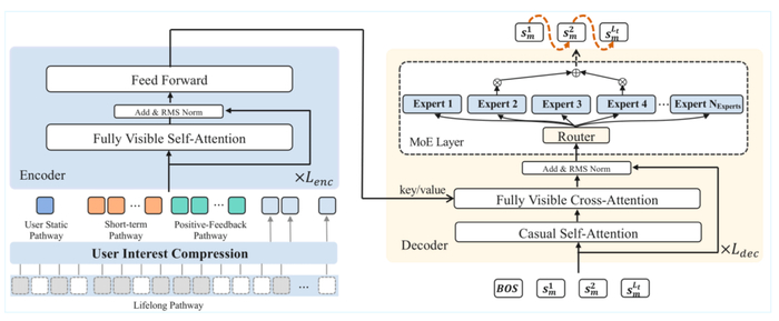 2、推荐生成(Decoder):基于兴趣向量,由大模型的 MoE 解码器一步步生成推荐内容,实现内容匹配和排序。