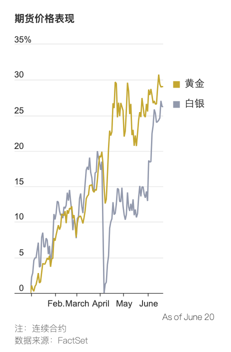 6月交割的白银期货周三收于每盎司36.866美元,6月迄今已上涨12%。黄金收于3,389.80美元,今年以来上涨了29%,本月上涨了3.1%。