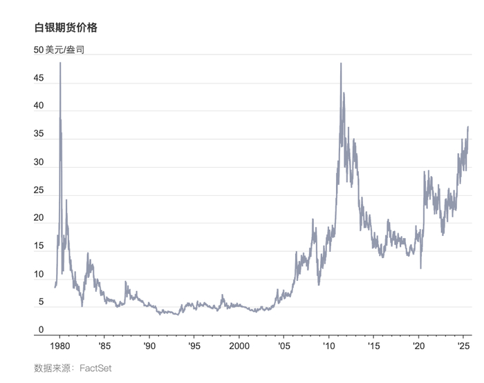 2011年,白银价格在一场投机狂潮中再次飙升,达到47.99美元,相当于现在的约69美元。就像1980年一样,银价的下跌速度几乎和上涨速度一样快。