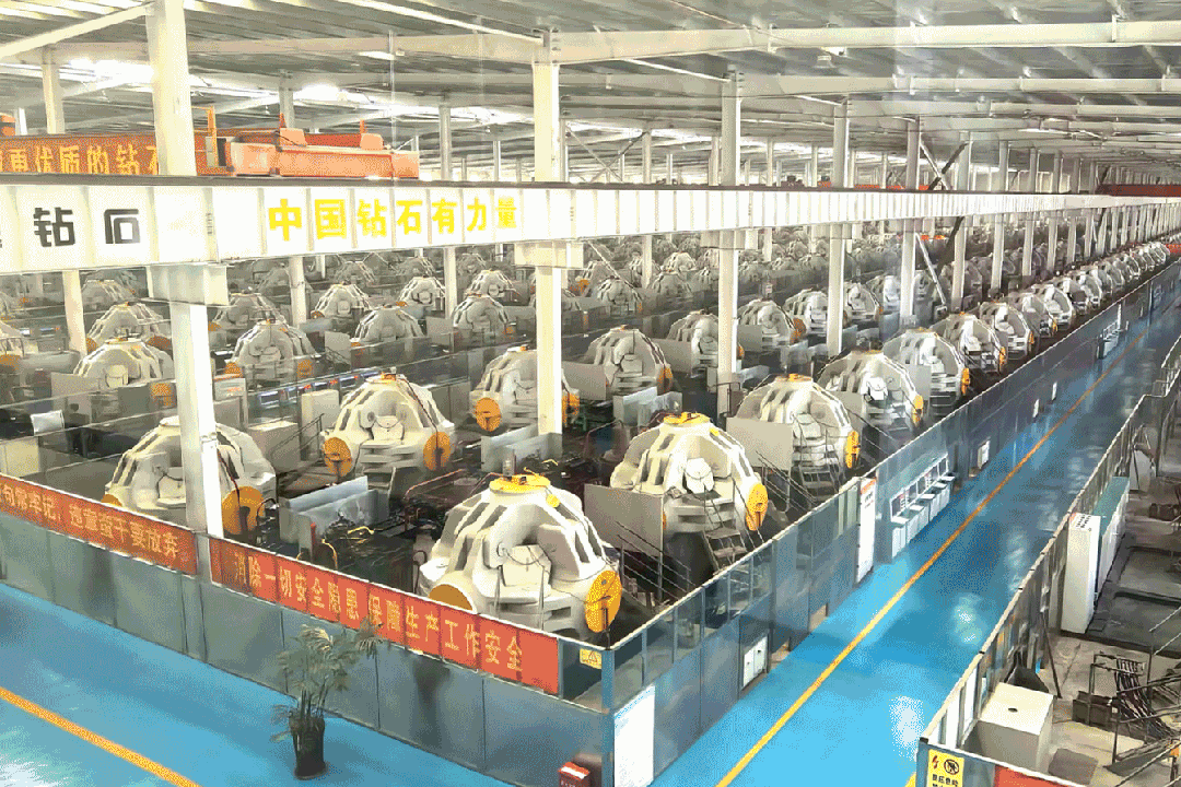 我在力量钻石的生产车间看到,有600台六面顶压机正在运行,这是全世界规模最大的培育钻石车间。由于高度自动化、智能化,车间里只有不到10个工人。