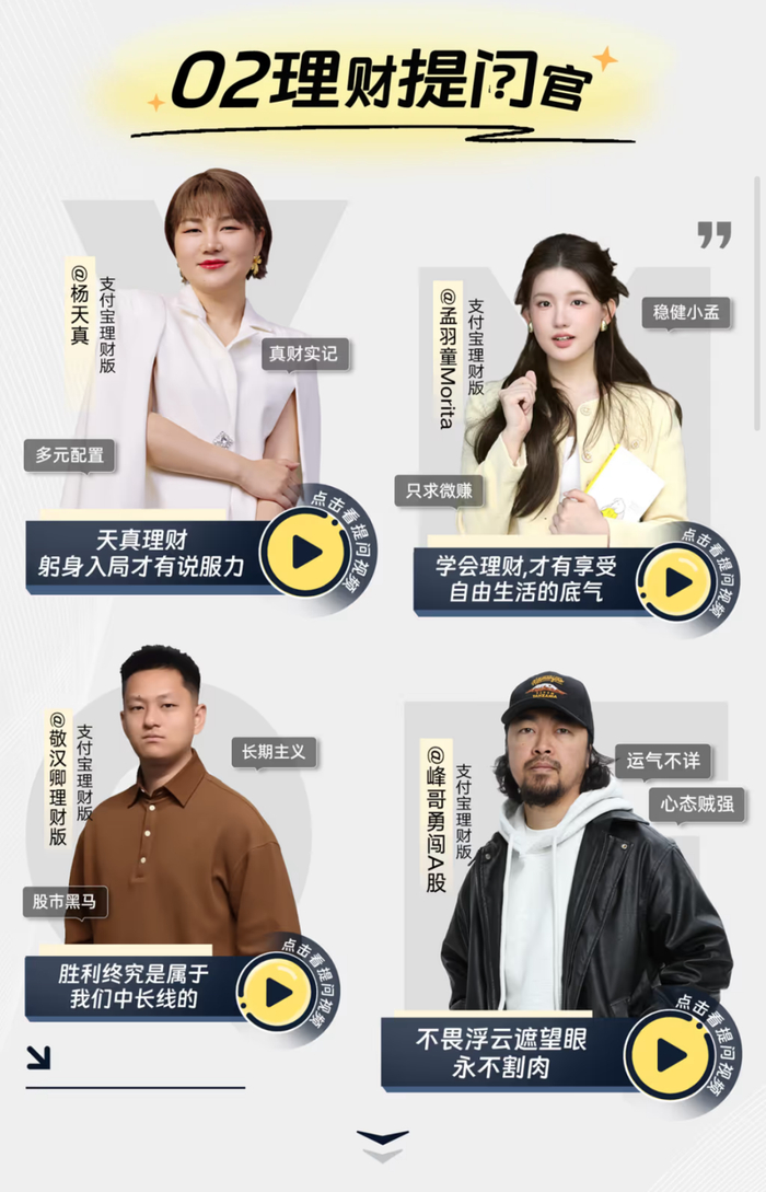 比如小声比比就重视专业性和趣味性的平衡,让理财内容也达到“心理按摩”的效果;峰哥则是通过采访,挖掘普通人的财富故事,也分享自己的理财心得;杨天真更是亲身实操示范,计划拿出20万元在支付宝上理财,目标是不亏钱。