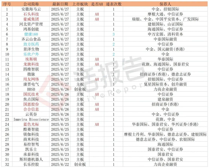 最近一周,递表井喷,32家公司递表,分别是斯坦德机器人、承泰科技、酷赛智能、蓝色光标(AH)、易控智驾、凯乐士、镁伽科技、商米科技、Immvira Bioscience Inc. - B、合合科技(AH)、云英谷科技、国民技术(AH)、国恩科技(AH)、焦点国际、BBSB、齐云山、康晋电气、微脉公司、石头科技(AH)、用友网络(AH)、四维智联、龙旗科技(AH)、埃斯顿(AH)、乐欣户外、景泽生物、劲方医药、健康160、鸿基创能、河北资产管理、豪威集团(AH)、海马云科技、长乐控股,其中9家是AH上市公司。