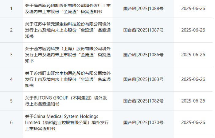 此外,康哲药业、不同集团、旺山旺水、劲方医药、中慧元通、海西新药6家公司通过境外上市备案。
