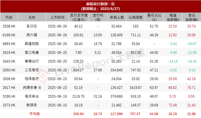 据LiveReport大数据,近10家上市新股平均发行市值为359.84亿,最大市值为海天味业,最小市值为香江电器;平均发行PE为18.74倍,PE处于中高位水平;平均申购人数为117,996人,平均认购倍数为707.47倍;平均基石占比为44.98%,基石平均比例区间波动;