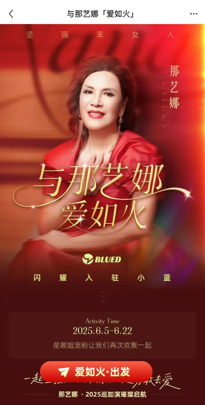 此次那艺娜的爆火,正是因为被走在玩梗、解构主流前沿的彩虹群体选中,经由这一群体的率先互动,最终点石成金,引发更多乐子人的追捧,由此那艺娜还被彩虹群体称为“这是我们一手调教出来的英雄”。这种极强的圈层化也让那艺娜与Blued双向奔赴,演出前,该巡演消息就登上了Blued开屏宣传位,演出现场,Blued广告更是以玩梗方式穿插在中场。