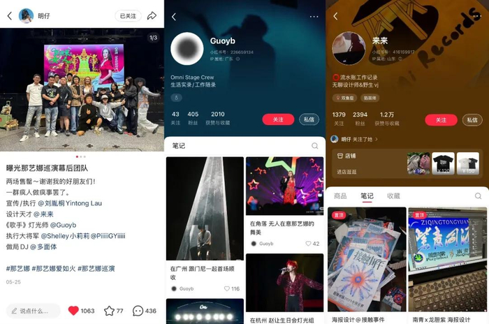 根据账号内容,“舞台导演”@明仔 此前参与过长春哦啦音乐节、天津泡泡岛、芒果音乐节等大型音乐演出;做巡演设计的@来来 晒出的其他作品,都是正经审美在线的音乐专辑、乐队巡演海报等;灯光@Guoyb也是与汪苏泷、陈立农、苏运莹等知名歌手合作过。