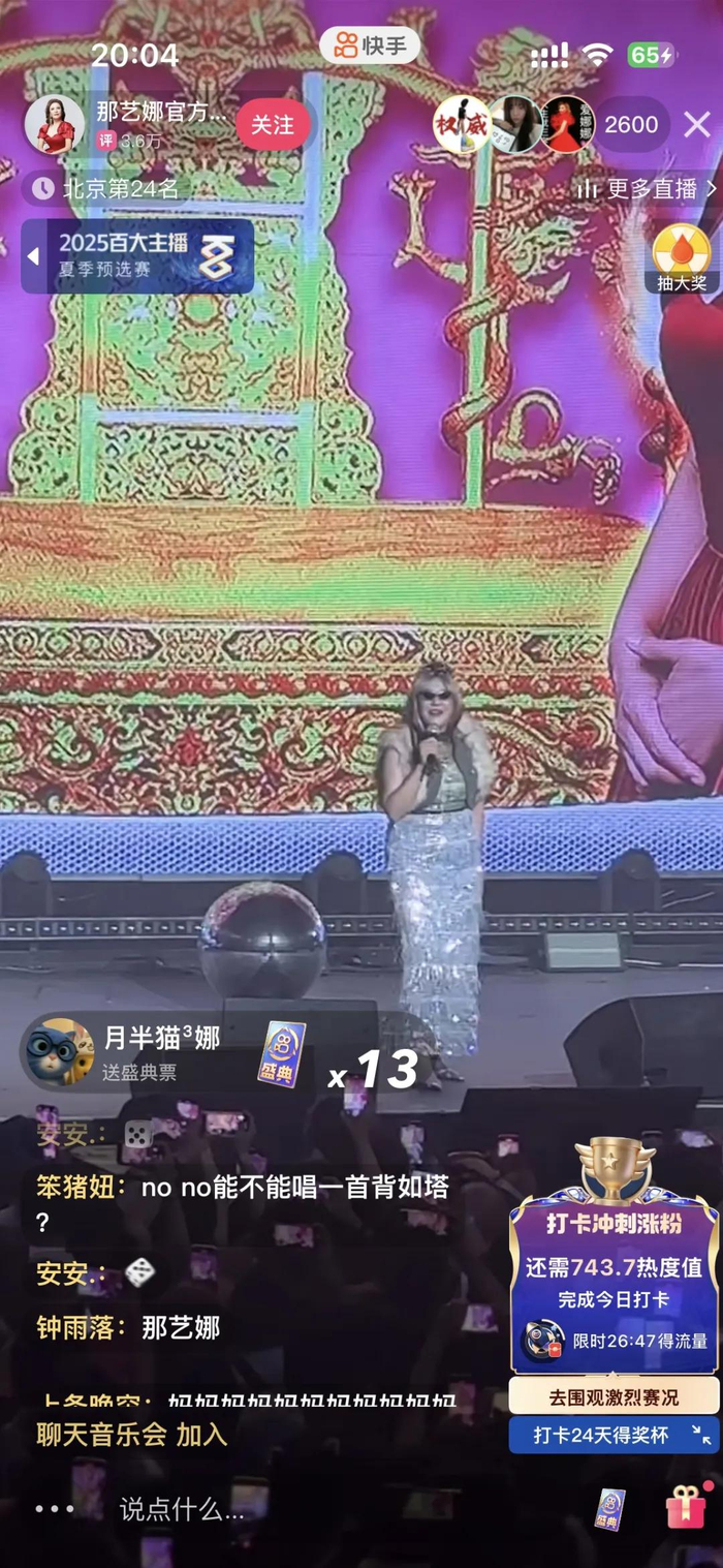 晚上8点,演出正式开始。然而开场前,那艺娜的快手官方直播间就开始在现场寻找乐子人,“我是娜娜10年老粉今年9岁”、“退票”、“娜娜给我道歉”......网上流传的段子,仿佛成了现场交际密码,成为融入现场氛围的关键词。