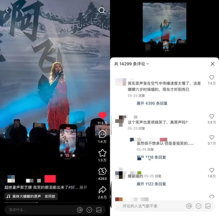 童声版的《苹果香》还引起了网友们的二创热情,“其实是声音在空气中传播速度太慢了,这是娜娜6岁时候唱的,现在才听到而已”、“娜婴唱的”、“买票进来只为喊一声退票”、“被DJ做局了”......评论区每个梗都可以笑3分钟。后续的演出中,现场DJ还会刻意放错音乐,那艺娜假装怒斥DJ后,开启真唱模式。