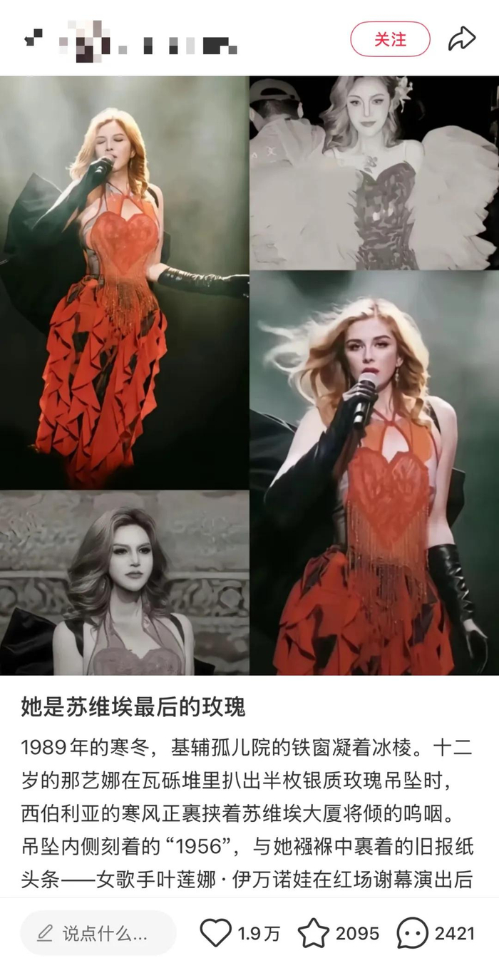 当年“俄罗斯娜娜”被封之后,那艺娜又以“大中国娜娜”的账号回归,并接触了北京群星伟业国际文化传媒有限公司,参加了其举办的“星耀中国好声音”,后又推出了《爱如火》。