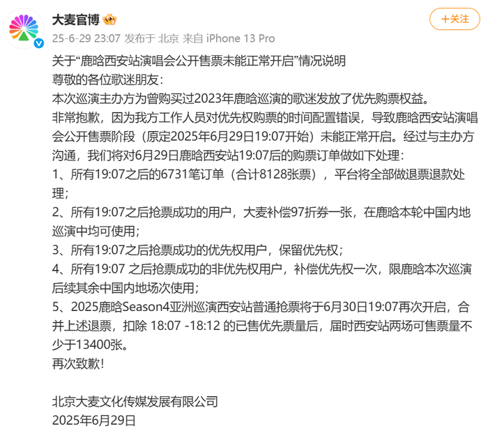 关于鹿晗西安站演唱会公开售票未能正常开启情况说明,图/大麦网官博