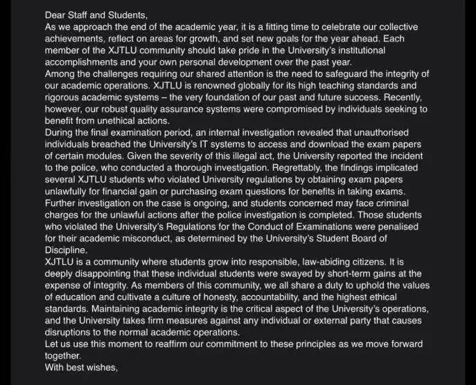 据扬子晚报/紫牛新闻消息,7月3日,西交利物浦大学教务办公室一名工作人员回应称,内部确实收到了关于此事的邮件,三名学生因非法获取试卷等问题被开除的情况属实。