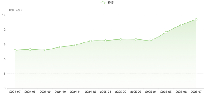 农业农村部全国农产品批发市场价格信息监测数据显示,去年6月至今,全国柠檬的批发价格始终保持上涨态势,2025年7月已达到14.08元/公斤,而去年同期价格仅为7.76元/公斤,同比涨幅超过80%。