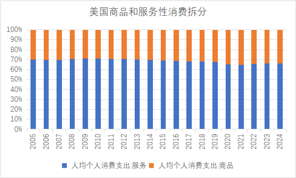 如果更长周期来看,可以对标美国——近20年,美国的服务性消费占比稳定在70%(日本占比为60%左右),那就意味着,远期中国服务性消费整体还有接近翻倍的空间。