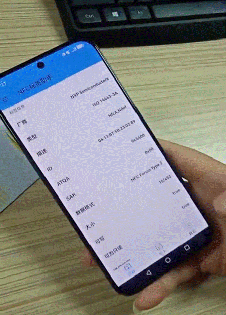 记者询问如何数据截图,该买家向记者发来了一段相关视频。据该视频显示,只需用具备NFC功能的手机,打开NFC应用,将门禁卡原始卡贴近手机,就能显示出相关数据信息,包含厂商、类型、ID、数据格式等。卖家介绍,卡片无所谓样式,“里面的芯片都一样”。