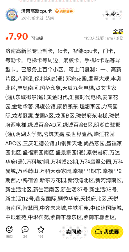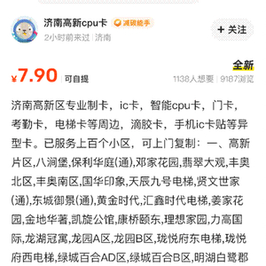 为进一步了解情况,14日,在二手交易平台闲鱼上,记者联系到一名为“济南高新cpu卡”的闲鱼卖家,从其业务介绍来看,除销售可直接使用的门禁卡外,还可上门复制门卡、智能CPU卡、电梯卡、考勤卡等,交易价格7元起,覆盖了济南近百个小区。