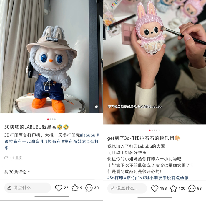 当这种即时满足的时间被延长到三个月之久的时候,有消费者转向了用3D机器打印,从此不光实现了labubu自由,甚至开启了3D版labubu的DIY之旅。