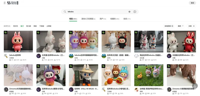 随着labubu从去年到今年的持续走红,越来越多的用户选择在MakerWorld自主上传labubu建模模型。尤其近两个月,该平台上labubu相关模型数量持续上涨。六月仅一个月,该平台模型的数量就从6月13日的663个,增长至如今的上千个,翻了一倍。截至7月9日,labubu的相关模型下载量已超过3.3万次。