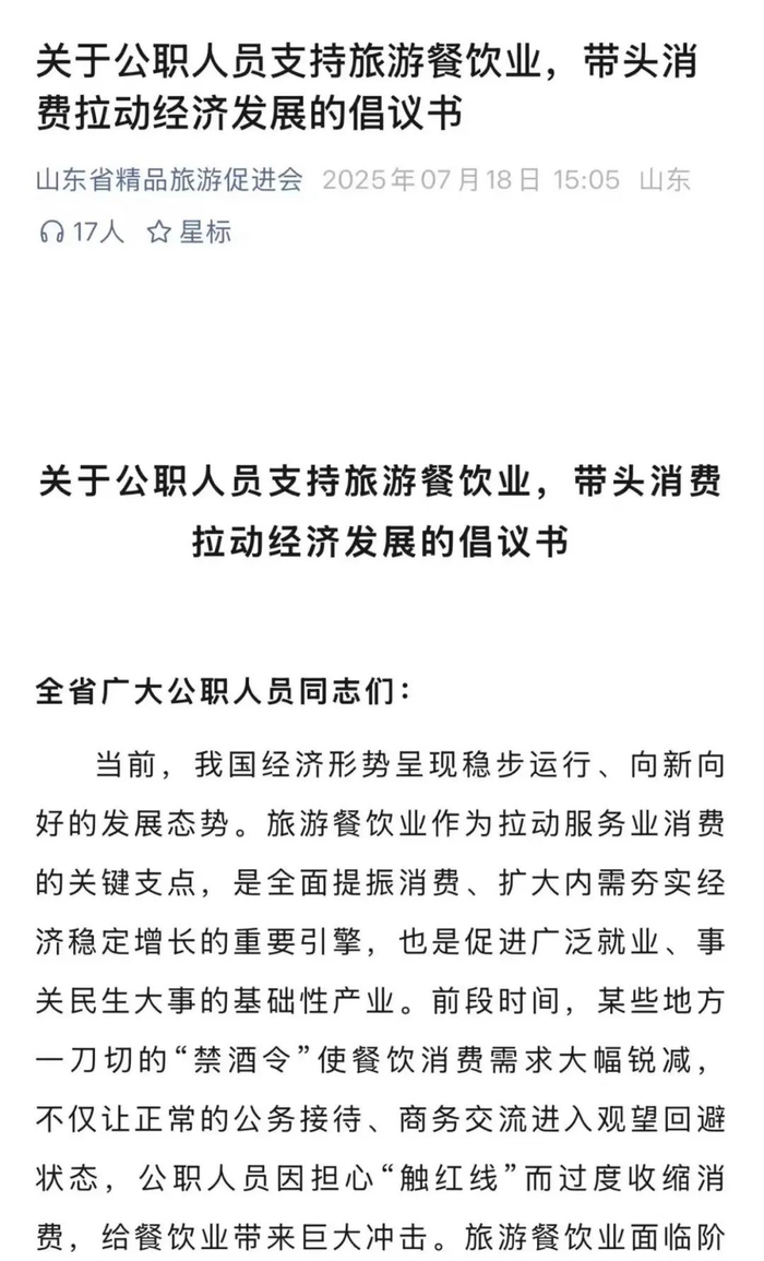 7月18日,山东省精品旅游促进会通过官方微信公众号发布《关于公职人员支持旅游餐饮业,带头消费拉动经济发展的倡议书》,内容包括倡议全省广大公职人员做践行合规消费、助力消费增长的带动者,主动参与日常消费、优先支持本地特色服务;做强化责任担当、引领社会消费的示范者,带动亲友参与消费,反馈建议优化服务等。