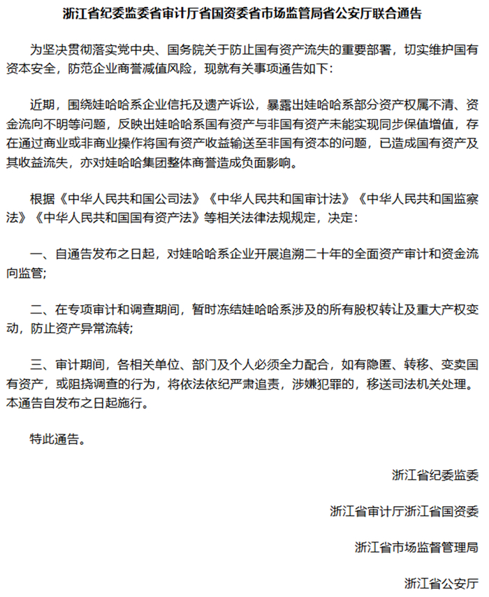 浙江5部门通告追溯娃哈哈20年资金流向?假消息!
