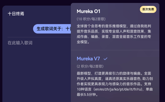 Mureka模型现在上线了三个版本,v6,v7和o1。