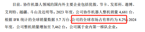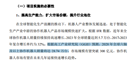 事实上,这种担忧并非多余。尽管2023年节卡股份协作机器人整机销量达4681台,以IFR统计的全球5.7万台销量计算,其全球市场占有率约为8.2%,已跻身行业第一梯队,显示出一定的市场竞争力。同时,从行业增长预期来看,节卡股份在申报稿中引用高工产业研究院(GGII)的数据显示,2028年全球六轴及以上协作机器人销量预计将达28.74万台,市场规模有望突破300亿元,行业增长空间看似可观。