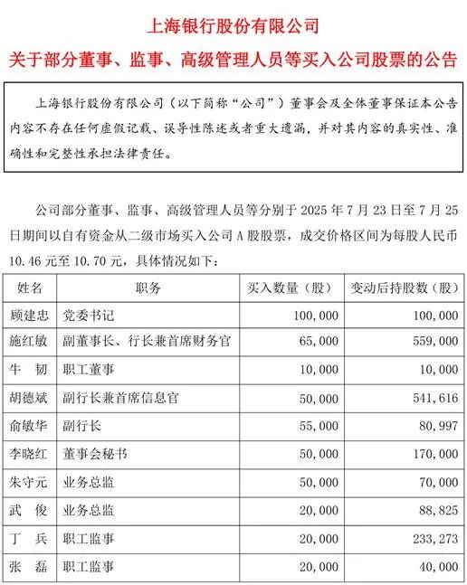 值得关注的是,在任职资格获批前,顾建忠已于7月25日联合9名高管集体增持,其个人购入10万股,耗资超百万元,团队合计投入460万元,买入价每股10.46-10.70元。此举被市场解读为管理层对银行经营前景的主动背书,给市场递上一颗“定心丸”。