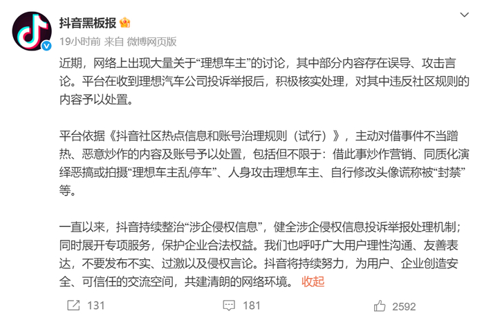 8月12日,抖音黑板报官方微博发文称,近期,网络上出现大量关于“理想车主”的讨论,其中部分内容存在误导、攻击言论。平台在收到理想汽车公司投诉举报后,积极核实处理,对其中违反社区规则的内容予以处置。