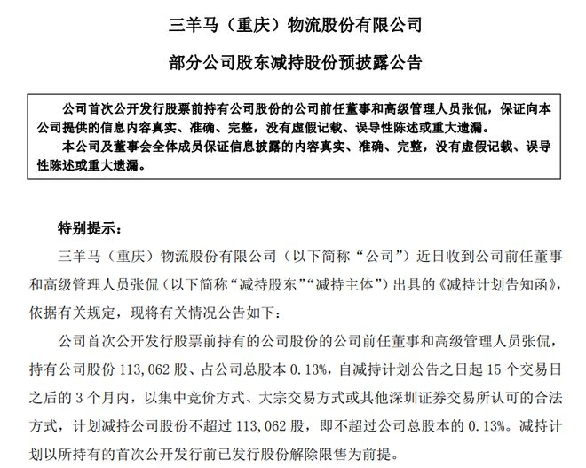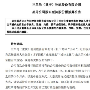 三羊马:一股东拟减持不超0.13%股份,不超过11.31万股