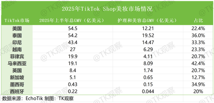 具体至TikTok电商生态,美妆个护无疑是TikTok电商生态中最炙手可热的赛道,这一点从其频繁登上各类跨境资讯平台头条、快讯热门话题的现象便可窥见一二。根据第三方数据显示,2025年上半年在TikTok Shop全球各站点中(不包括新开站点),除新加坡市场(TOP2),美妆个护类目展现出极强的市场统治力,无论是在东南亚还是欧美,美妆个护均持续稳居前十大类目的榜首位置。以TikTok美区为例,该类目以22.4%的GMV占比登顶全类目销售额榜首,用户复购率达32.6%,较平台平均水平高出8个百分点。这种TikTok全区域的持续领跑态势,进一步验证了美妆个护作为TikTok核心赛道的稳固地位。