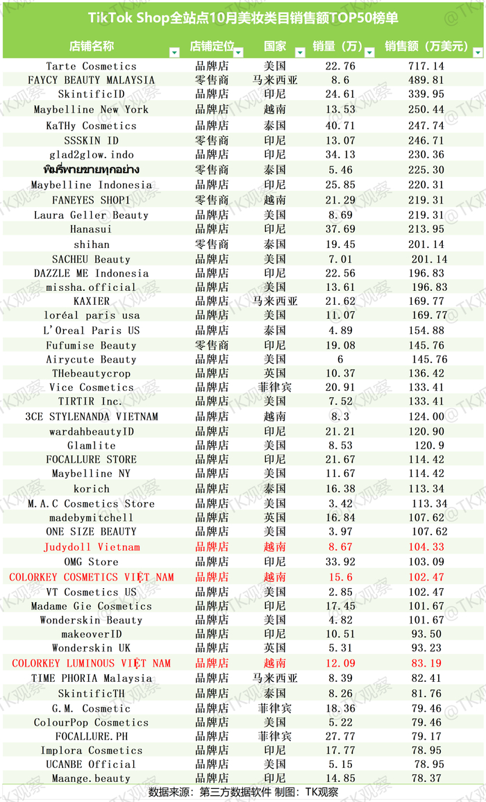 值得关注的是,国产品牌在10月榜单中表现亮眼,珂拉琪(COLORKEY)与橘朵(Judydoll)的越南店铺成功入围,珂拉琪以“COLORKEY COSMETICS VIỆT NAM”(102.47万美元)和“COLORKEY LUMINOUS VIỆT NAM”(83.19万美元)两家店铺上榜,稳居TikTok越南美妆头部行列,橘朵则依托“线上TikTok内容种草+线下场景渗透”的协同策略,将国内成熟的产品创新力与东南亚本土化需求结合,在东南亚市场广受好评,其以“Judydoll Vietnam”店铺实现104.33万美元销售额,与珂拉琪等品牌共同构成越南市场国潮美妆核心力量。整体而言,10月榜单不仅反映了区域市场的消费偏好,也为国产美妆品牌出海在不同市场的策略选择提供了参考——高端品牌路线可选欧美市场,以线上TikTok电商平台为阵地,实现低成本轻量入局;选择深耕规模性价比,则可考虑东南亚市场,结合品牌在东南亚细分市场资源,优先选择本土布局。
