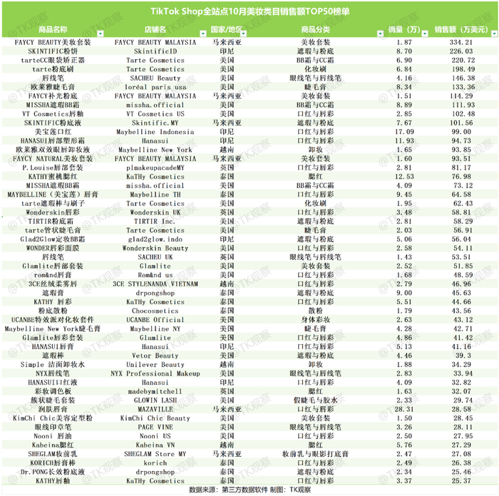 聚焦二级美妆类目来看,在TikTok Shop全站点10月销售额TOP50的产品榜单中,美区市场商品几乎占据“半壁江山”,Tarte、美宝莲、谜尚等知名品牌均榜上有名;东南亚四国合计占据24个席位,凸显了该区域对高性价比、适配本地肤质与审美的美妆产品的旺盛需求。值得关注的是,此前“美妆大户”印尼10月表现不佳,榜单席位数被泰国反超。另,据TK观察整理发现,本次10月榜单中,销量超10万单的商品多数并未入选,且这类高销量店铺几乎全部源自东南亚市场。这一现象反映出东南亚消费者“高频低价”的消费习惯与销售额为导向的榜单筛选标准存在隔阂,低价策略虽能拉动销量,但利润空间有限。而美区能在东南亚产品的包围中突围,核心优势在于客单价偏高,其美妆产品售价集中在10-30美元,部分中高端产品单价超40美元,更高的利润空间使得卖家为在内容种草、达人合作等环节提供了充足的预算支持。