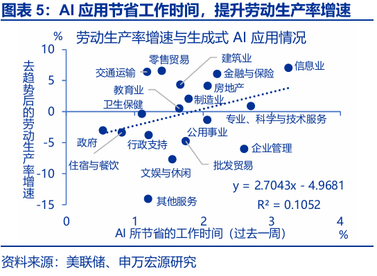 随着美国AI采用率的全方面提升,市场对于AI替代就业的担忧也逐步加深。AI 在各领域的应用,本质是以更少投入创造同等乃至更高价值。宏观数据显示,AI 应用节省的时间越多,行业劳动生产率增速越高(见下图)。但是,AI采用率的提升也引发市场对就业的担忧:2025年以来美国WARN裁员率大幅提升,10月美国挑战者裁员数达15.3万个,较去年同期提升175%,其中21.7%来自科技行业。