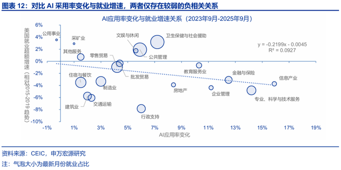 1)美国AI采用率提升与就业增速变化,仅仅呈现为弱负向关系。2023-2025年,美国各行业就业增速(相比2015-2019年趋势),与其AI采用率提升幅度呈现一定负向关系。但是,两者散点图趋势线的R²仅为0.09,说明相关性薄弱;