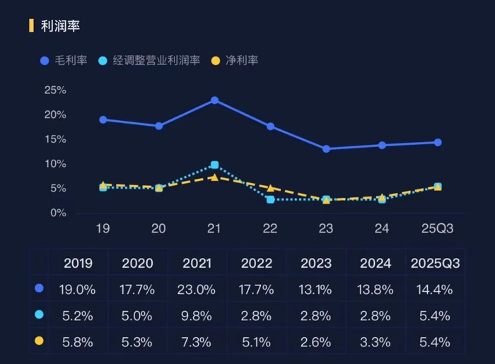 2021-2022年,受行业价格战和原材料价格上涨双重挤压,盈利能力大幅下滑。2023年开始企稳,2024年明显回升,2025年前三季度则呈现爆发式增长。
