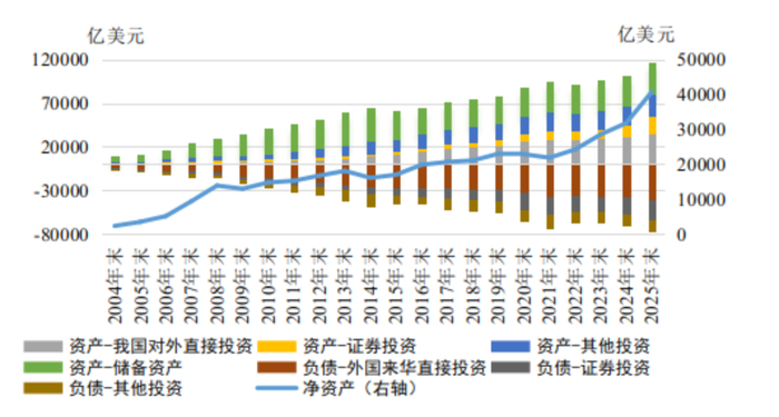 《2025年中国国际收支报告》显示,2025 年末,我国对外金融资产和对外金融负债分别为11.8万亿美元和 7.7万亿美元。