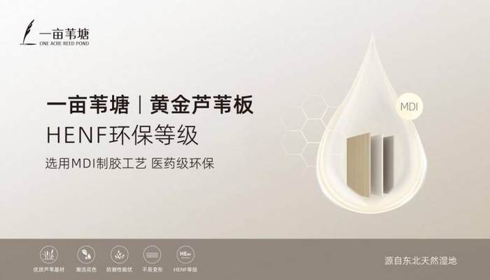 在胶粘剂选择上,“一亩苇塘”黄金芦苇板采用MDI生态胶技术。该胶粘剂属于高分子聚合物,其分子结构中不含甲醛基团,有助于实现环保工艺目标。同时,MDI生态胶具有良好的胶结强度,能够提升板材的内结合强度和静曲强度,从而改善板材的整体结构稳定性。经检测,该板材达到HENF环保等级,有助于从源头降低有害物风险,适配儿童房、老人房、母婴空间等对健康要求较高的场景,让家居环境更安心